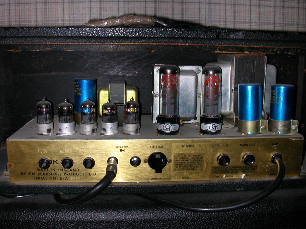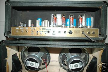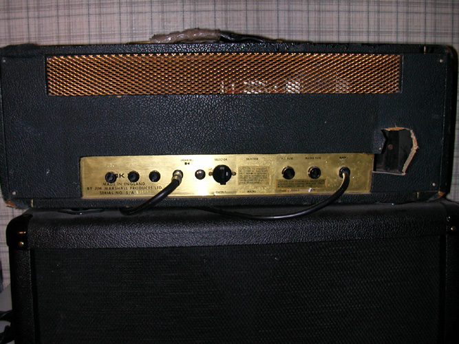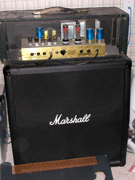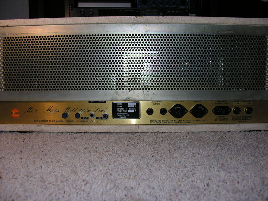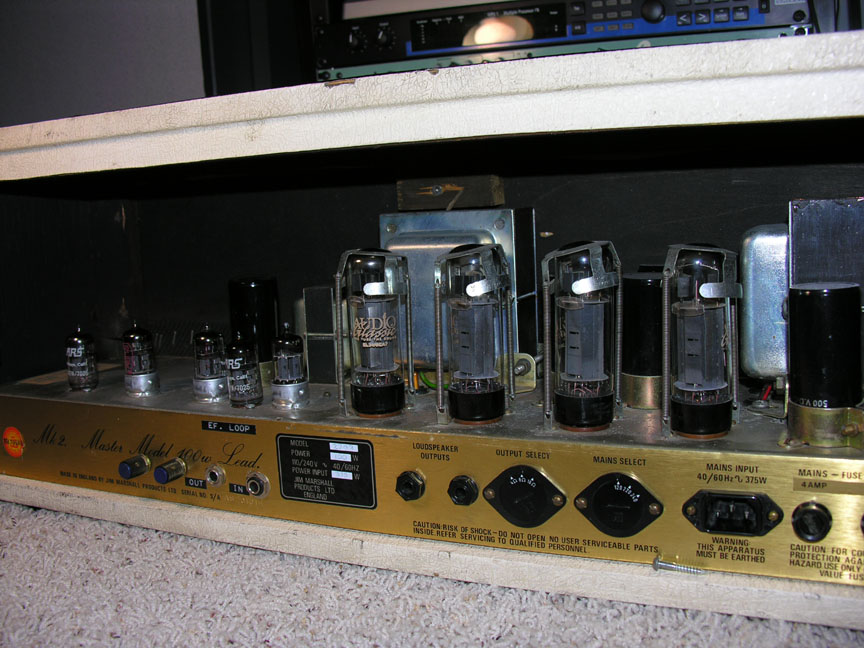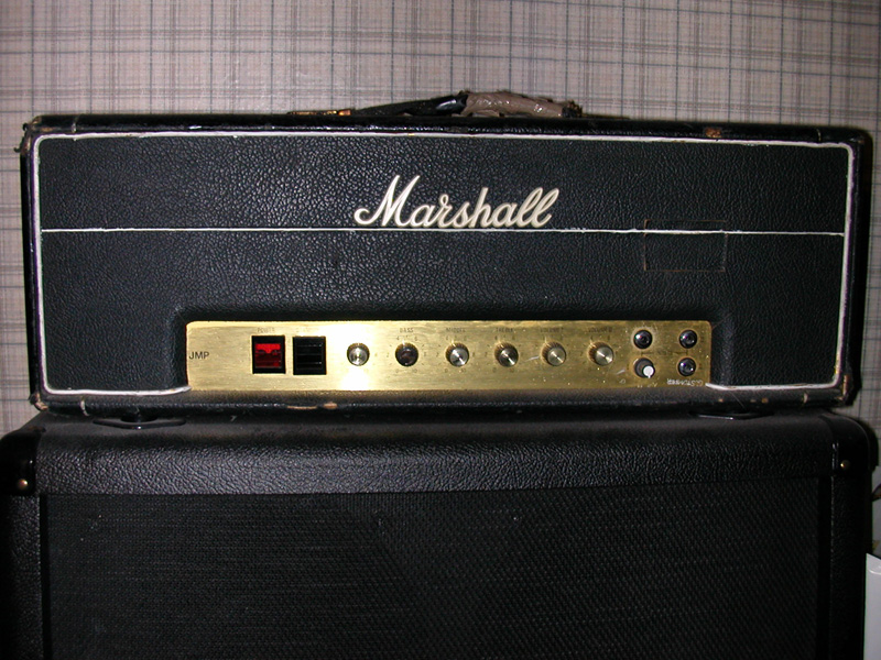 * 1977 Marshall JMP MK II Lead head, 50 watts, modified by Todd Langner for me. Two additional preamps tubes were added and an (tube buffered) effects loop, as well as two master volumes with another footswitch jack to switch between them for that extra boost for live leads (I wanted the extra push from the preamp/poweramp of the head, and not use a volume pedal from my guitar signal). I had this modified in maybe 93 or 95 (I don't recall)? It gets everything from AC/DC, to Zep, to Lynch, to EVH, to Rhoads, to Pantera. I basically wrote a 6 page essay on exactly how I wanted the dynamics to sound, the attack, drive, crunch, punch, sustain, full bodied, all notes ringing out, and good break up. I can't really put this into words, it's probably the best amp I've ever heard. I sold this back in 96 or 97 and ended up regretting it, and realized I'd never likely have an amp that good sounding again, so I kept bugging a friend I sold it to for years and ended up trading a VHT Pitbull 50/CL I had at the time, a few hundred dollars and a new set of tubes I got for the VHT to get it back. That was two or three years ago now. I still need to put in better tubes and bias this thing (I'm lazy). I got this amp in Sacramento about a month before I had it modified. It looks like crap/totally thrashed, but who cares what it looks like. Even clean, before the mod, it was the best sounding clean amp I've ever heard. Just to note, I have a 1977 Marshall 50 watt MK II 2x12 combo, exactly like my pre-modified amp head--literally everything is exactly the same (only a few hundred off the serial of the one I had modified), so I do have that great clean sound, though it isn't as good as the clean I got from this head before I had it modified. I regret not asking if I could have it be a two channel head with the mod, but I can work on that later myself. This modded head is actually a '77 combo MK II put into a smaller box head. So, the combo really is the same amp, and the head and combo were the same thing anyway. I might mod this, might sell it, or who knows, but it will have clean, and so will the head.
