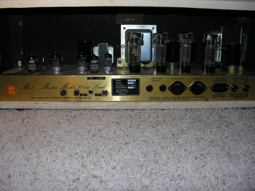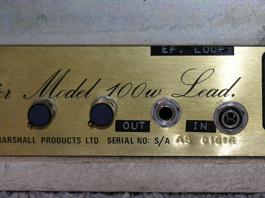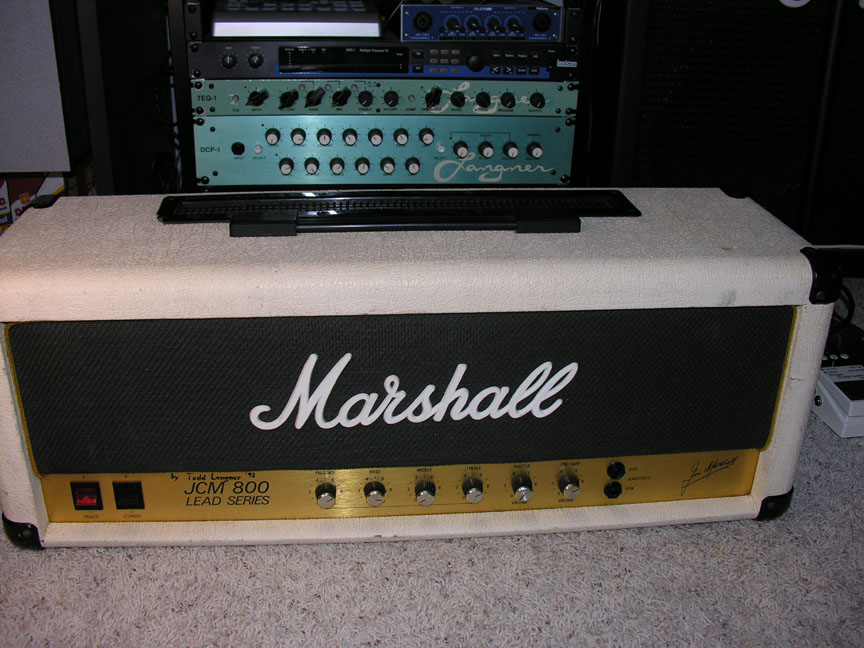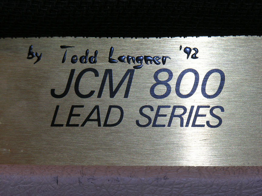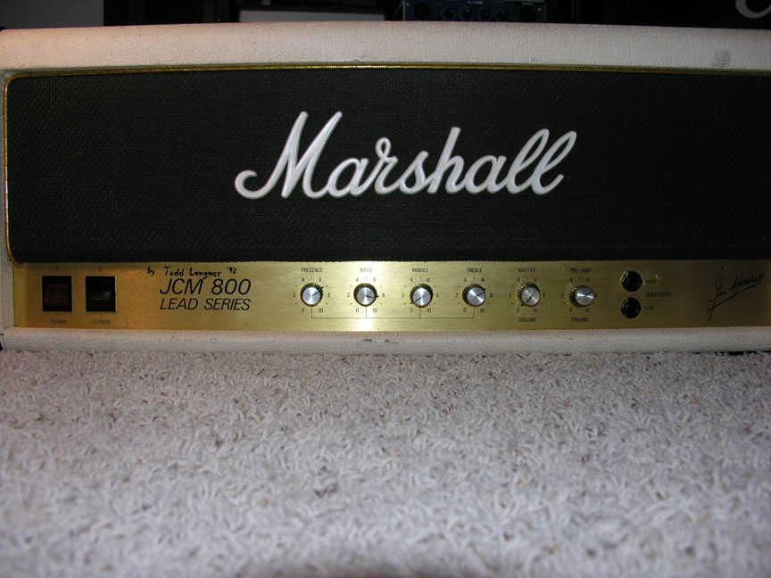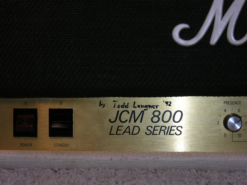 * 1983 Marshall JCM 800 Lead, 25th White Anniversary 100 watt head, modified by Todd Langner in '92. NOTE: This is the description of this amp that I saw a while ago on a "Tube amp mod Hall of Fame" page. I tried to track this amp down, but failed and then one day saw it on eBay and grabbed it! Small world! I actually talked to the guy that had it modified--he's the guy that built the Langner cabs (only 8 ever made) and head enclosures (only 4 amp heads made), most of which were sent to Germany. He regretted selling it on eBay many years ago and didn't know what happened to it either (the tube amp hall of fame guy I contacted said he just copied the details from the original ebay auction). Anyway, now I have it. :-) "This amp runs on five (5) 12AX7 and four (4) EL-34 tubes. Effects Loop is completely tube buffered with separate level controls for effects send and effects return. "Straight Beef Mod" delivers Todd's signature crunch and ultra high gain with the perfect match of a classic Marshall EL-34 power section. (classic JCM 800 crunch at preamp levels 1-2; modern JCM 900 gain at preamp levels 3-4; "boutique" high gain by preamp level 5; and over-the-top ultra gain from thereon). "Effects Loop" modification is a fully buffered tube effect loop with separate send and receive levels (when the loop is not used, all loop circuitry is disengaged, retaining amplifier's original design)."