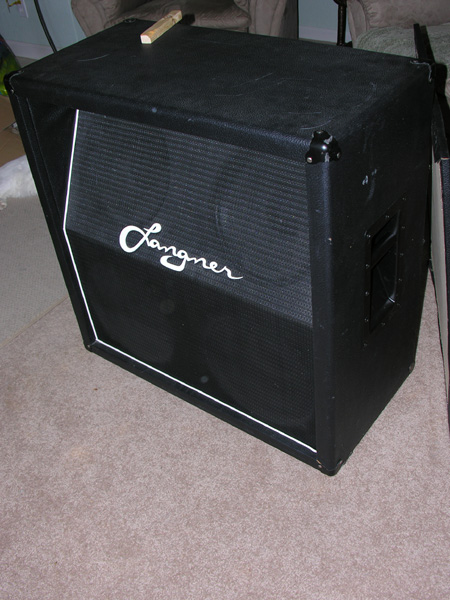 * Three Langner 4 x 12 Speaker Cabinets. The Langner 4x12 speaker cabinet is a revolutionary design. Instead of just copying the other standard 4 x 12 designs, the Langner cabinet exceeds standard 4x12 performance. Cabinets come loaded with Celestian 50 watt speakers. I had two of them shipped from Germany, one about a year after the other (from another owner). One of these cabs has 75 watters in it now, which are fine, but I'm going to swap those out with 50 watters, just like it was originally designed to use/have. The other Langner cab has the following speakers: Eminence EM 12-75L (top left), Eminence EM 12-100PL (bottom left), Celestion Vintage 30 (top right), Celestion G12H (Greenback, 70th Anniversary Special Edition) on the bottom right. The third can I got from a guy in San Francisco and as I type this, it is unloaded. I have some custom made Scumback speakers I'll probably put in it.