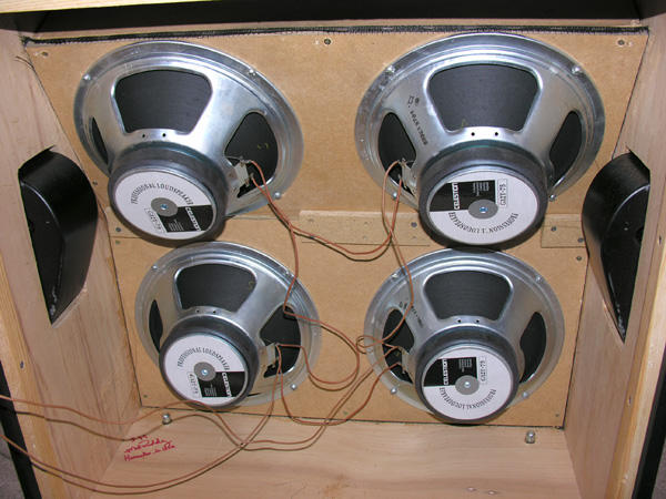 "Custom made using hand selected 3/4" Norwegian Burch, this top (slant) cabinet was designed to provide the optimum advantage for mic placement for live and studio recording. The exaggerated angle of the top mounted speakers was designed to eliminate phase cancellation generally found in most cabinets caused by the dispersing sound waves crossing paths as they project outward from the speaker. This often causes each cabinet to have a "sweet spot" which would be the best place to position a mic to get the clearest sound. It's not always easy to find that spot, especially when you're setting up for a live performance. This cabinet was designed to eliminate the phasing of the sound waves at such a close proximity to each speaker allowing you to place a mic right underneath the recessed baffle and always be in that sweet spot, all the phasing happens a couple feet beyond the mic, not in it's path. Also when used as a bottom cabinet, it directs the sound right up at your ears and not your stomach, allowing you to hear what is actually coming out of the speakers, and gives you a more true stage tone than what you'd hear through the monitors.
