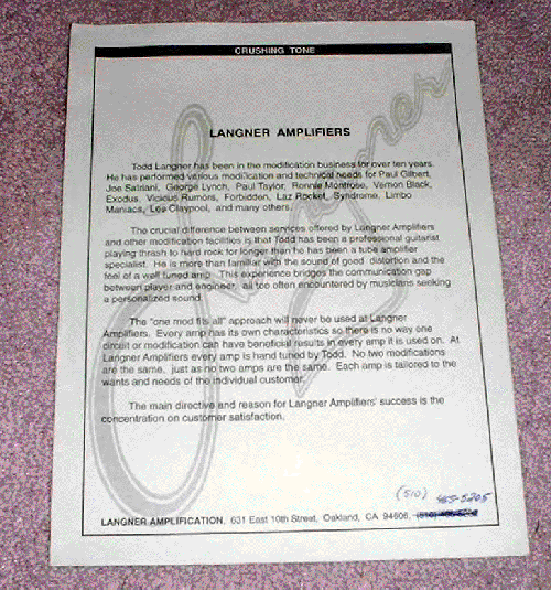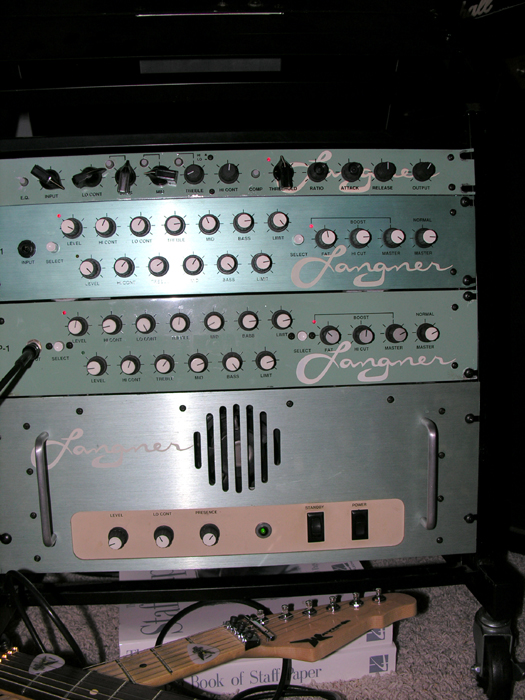 * Wanted: I might pick up one or two more Langner modified Marshall heads. A '73 Marshall 100 watter and a '69 Marshall 100 watt Plexi. I'm also interested in other Marshall's modified by Todd Langner. Other than that, I'm looking for a Langner TDP-1 tube Distortion Pedal, and mostly, I'm looking for a Langner ATC-1 Concert Pro tube amp head (though I spoke with the person whom was the old German Langner distributor and he said that they sounded great "when they worked". Apparently he owned 3 Langner ATC-1 heads at one point and said they had problems. I found this guy when I found his band's site (in Germany) and saw two Langner full stack of cabs (4 x Langner 4x12's -- looks like two slant and two straight cabs), and a Langner DCP-1 Elite preamp through some other power amp (don't recall the brand). He said he won't sell any of his Langner stuff). Anyway, those pictures...